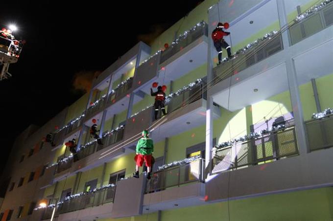 Ιπτάμενοι πυροσβέστες Αγιοβασίληδες μοίρασαν δώρα σκαρφαλώνοντας στον τοίχο