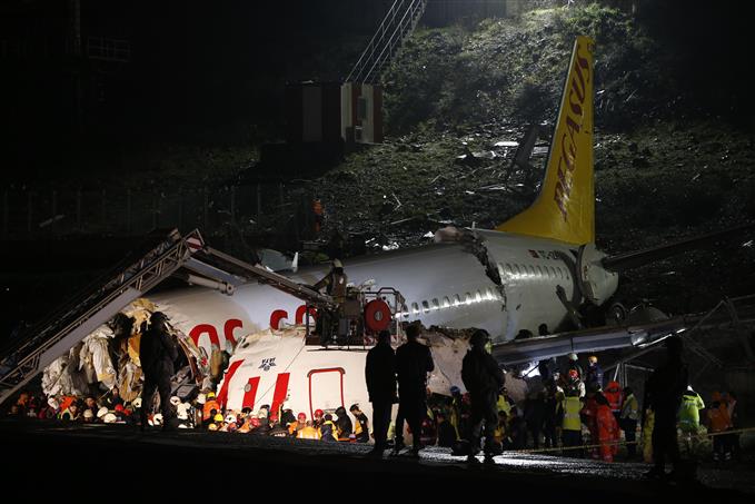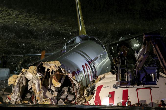 Η άτρακτος του αεροσκάφους Boeing 737 της ιδιωτικής τουρκικής αεροπορικής εταιρείας χαμηλού κόστους Pegasus κόπηκε στα τρία και πήρε φωτιά, ενώ στο εσωτερικό επικράτησε πανικός