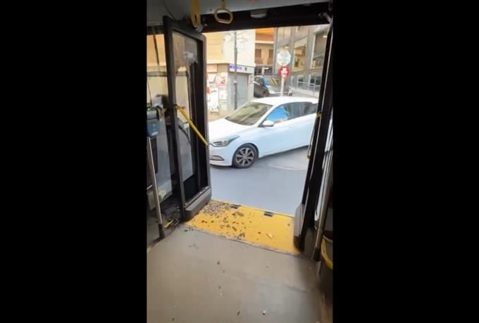 Τα σπασμένα τζάμια είναι μέσα στον χώρο του λεωφορείου, με σοβαρό κίνδυνο ατυχήματος