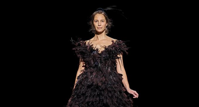 Το 50χρονο μοντέλο εμφανίστηκε με ένα εντυπωσιακό μαύρο κοκτέιλ φόρεμα από φτερά συνδυασμένο με αντίστοιχο αξεσουάρ στα μαλλιά