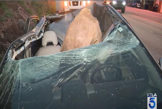 Τυχερός στάθηκε ένας οδηγός στο Μαλίμπού, που παραλίγο να τραυματιστεί από έναν τεράστιο βράχο που έπεσε πάνω στο αυτοκίνητό του