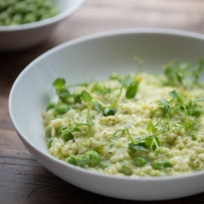 Αν σας αρέσουν τα πιάτα με βάση το καλοχυλωμένο ρύζι, δοκιμάστε αυτή τη συνταγή που έχει τη γλύκα του αρακά, την αλμυρή και τόσο ιδιαίτερη γεύση του μπλε τυριού και την ανοιξιάτικη φρεσκάδα το πράσινων κρεμμυδιών.