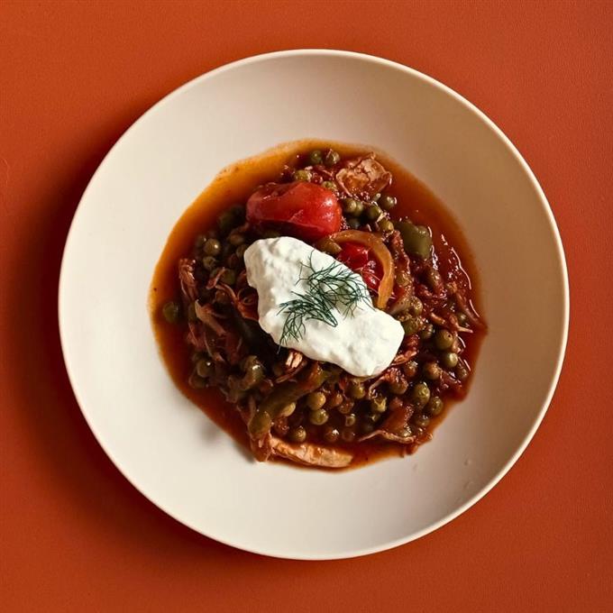 Συνταγή για να αξιοποιήσετε υπολείμματα βραστού ή ψητού κοτόπουλου ενισχύοντας σε πρωτεΐνη τον κοκκινιστό αρακά.