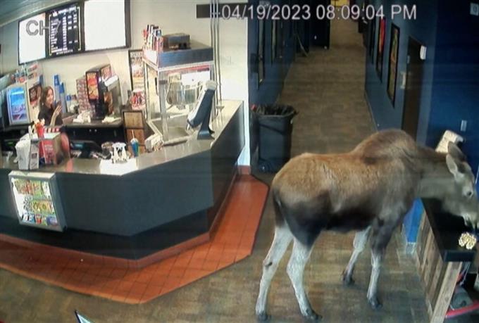 Μία άλκη εισέβαλε σε κινηματογράφο της Αλάσκας την Τετάρτη 19 Απριλίου και απόλαυσε λίγα ποπ κορν στο μπαρ του, πριν εγκαταλείψει τον χώρο αμέριμνα