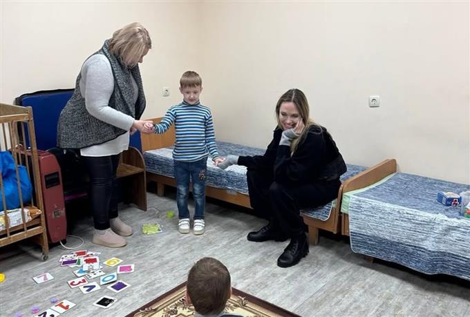 Η Αμερικανίδα ηθοποιός επισκέφθηκε ιατρικές εγκαταστάσεις, συμπεριλαμβανομένου ενός μαιευτηρίου και ενός παιδιατρικού νοσοκομείου, σε μια πόλη που βρισκόταν υπό ρωσικό έλεγχο για αρκετούς μήνες