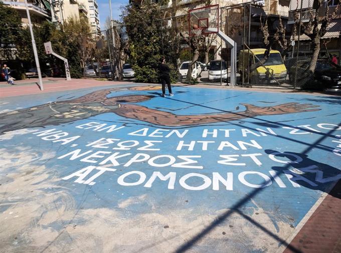 Μέλη αντιφασιστικής συλλογικότητας έστειλαν το μήνυμά τους για τον θάνατο του Εμπουκά, γράφοντας με μπογιά στο περίφημο γκράφιτι του Αντετοκούνμπο στα Σεπόλια