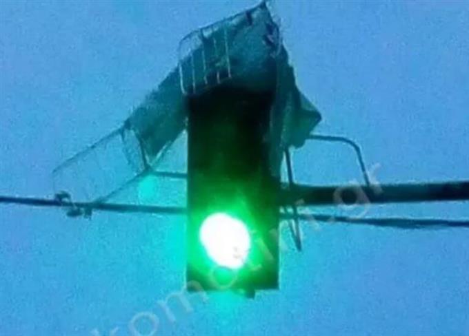 Μια απλώστρα, «έμφορτη»… ρούχων «απογειώθηκε» από κάποια βεράντα και «προσγειώθηκε» σε κολώνα φωτεινού σηματοδότη στον κόμβο του ΙΚΑ