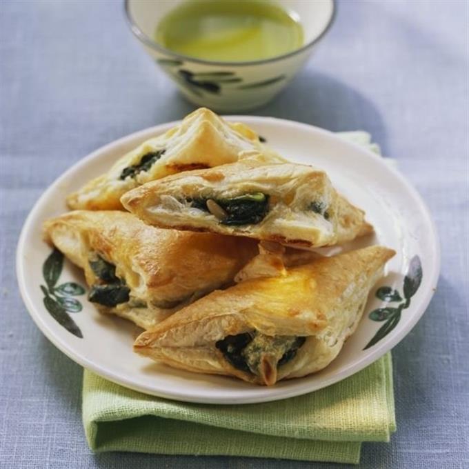 Λαχταριστά τριγωνάκια από σφολιάτα με πράσινη γέμιση και κουκουνάρι. Όποιος θέλει, προσθέτει και ψιλοκομμένο μπέικον για πιο πλούσια, καπνιστή γεύση.