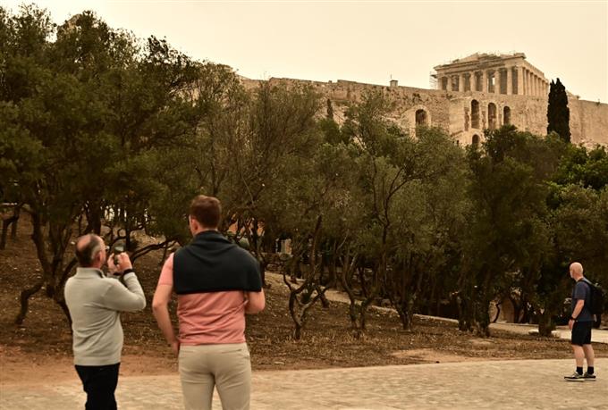 Τα χρώματα στον ουρανό δημιουργούν ένα απόκοσμο σκηνικό με την ορατότητα να έχει μειωθεί αισθητά