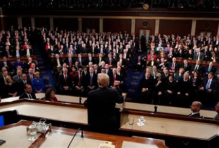 Παρά τις αποχωρήσεις των Δημοκρατικών, τα πλακάτ και τις λεκτικές αντιπαραθέσεις μέσα στην αίθουσα, ο Τραμπ διατήρησε έναν θριαμβευτικό τόνο στην ομιλία του