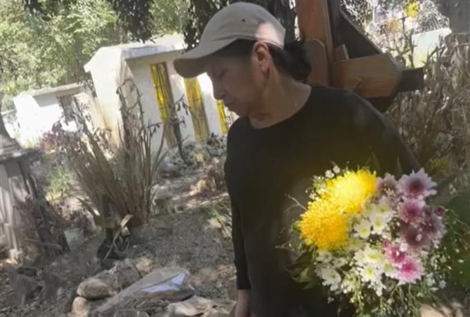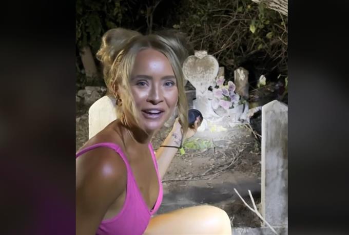 Στο βίντεο που έχει συγκεντρώσει 243.000 likes στο tik tok φαίνεται να ραντίζει με νερό τον τάφο και να αφήνει ένα μπουκέτο κίτρινα λουλούδια