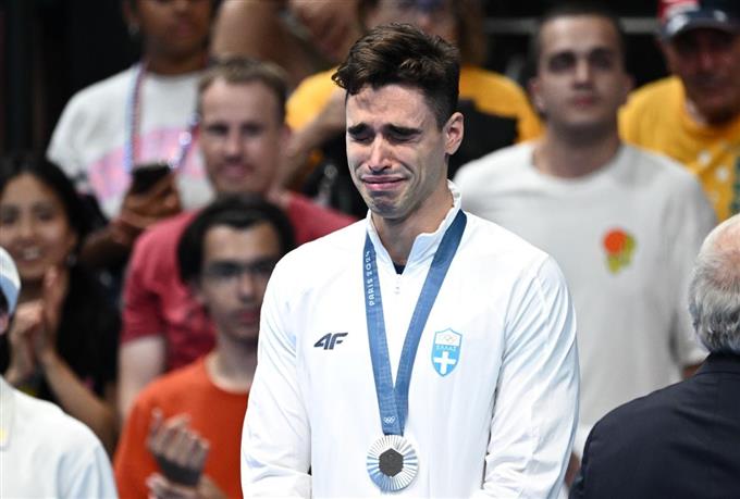 Με συγκίνηση που τον κατέκλυζε, ο Έλληνας πρωταθλητής ανέβηκε στο δεύτερο σκαλί του βάθρου