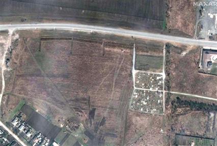 Στον τάφο αυτό, όπως λένε οι Ουκρανοί στρατιωτικοί, βρίσκονται οι σοροί περίπου 300 αμάχων μέσα σε πλαστικές σακούλες