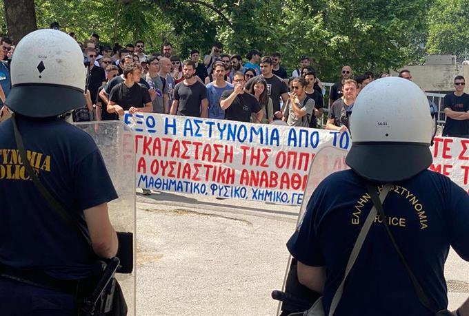 Αστυνομικοί σταμάτησαν στην είσοδο του κτηρίου τους 4 φοιτητές που πήγαιναν στη συνάντηση με τους καθηγητές και ζήτησαν έλεγχο ταυτοτήτων.
