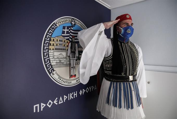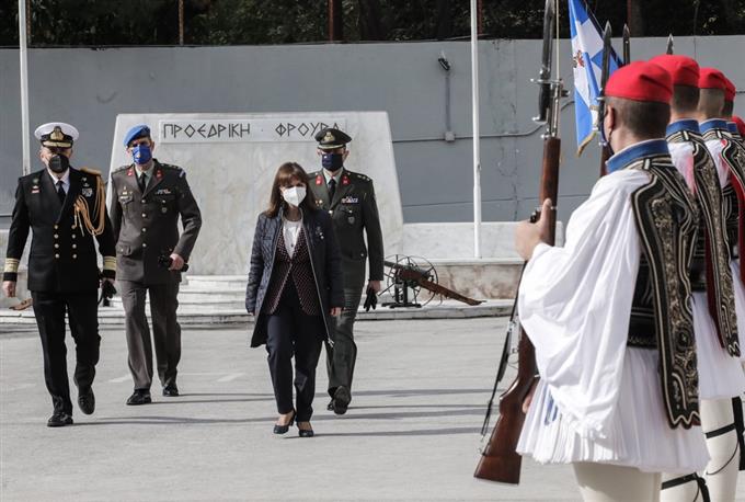 Η Κατερίνα Σακελλαροπούλου, μετέβη στην Προεδρική Φρουρά για να παραστεί στην τελετή εορτασμού του Αγίου Γεωργίου του «Φουστανελά»
