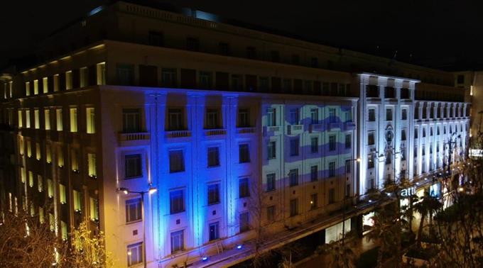 Η πρόσοψη του ιστορικού κτηρίου της πρωτεύουσας, στη συμβολή των οδών Βουκουρεστίου και Πανεπιστημίου, λούζεται με λευκό και γαλάζιο φως, αποτίοντας φόρο τιμής στην επέτειο των 200 χρόνων από την Ελληνική Επανάσταση