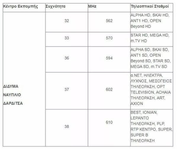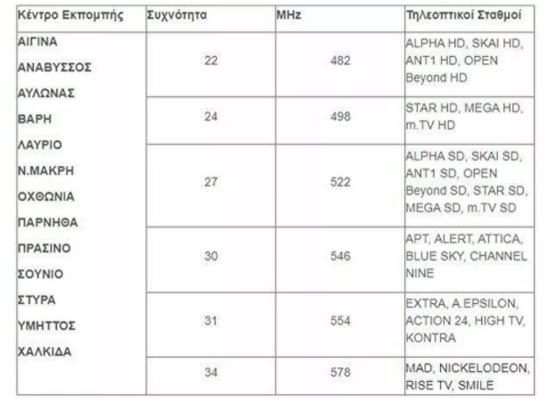 Θα χρειαστεί να επανασυντονίσουν τον δέκτη τους (τηλεόραση ή αποκωδικοποιητή) όσοι κάτοικοι λαμβάνουν επίγειο ψηφιακό σήμα από τα κέντρα εκπομπής που περιλαμβάνονται στους πίνακες: