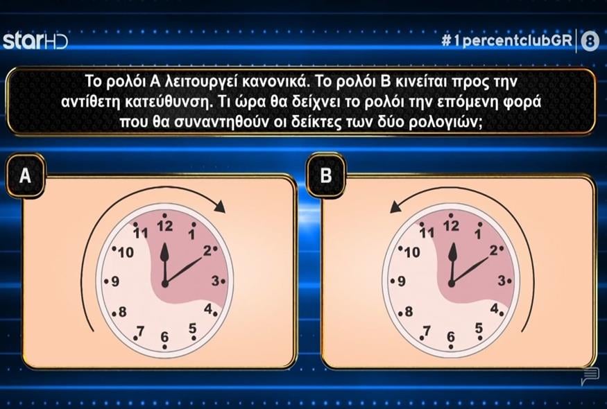 Η ερώτηση που έκρινε τους δύο νικητές ήταν μια ιδιαίτερη σπαζοκεφαλιά με δύο ρολόγια τα οποία έχουν την ίδια ώρα και πηγαίνουν αντίστροφα και οι παίκτες κρίθηκαν να απαντήσουν πότε θα συναντηθούν ξανά.