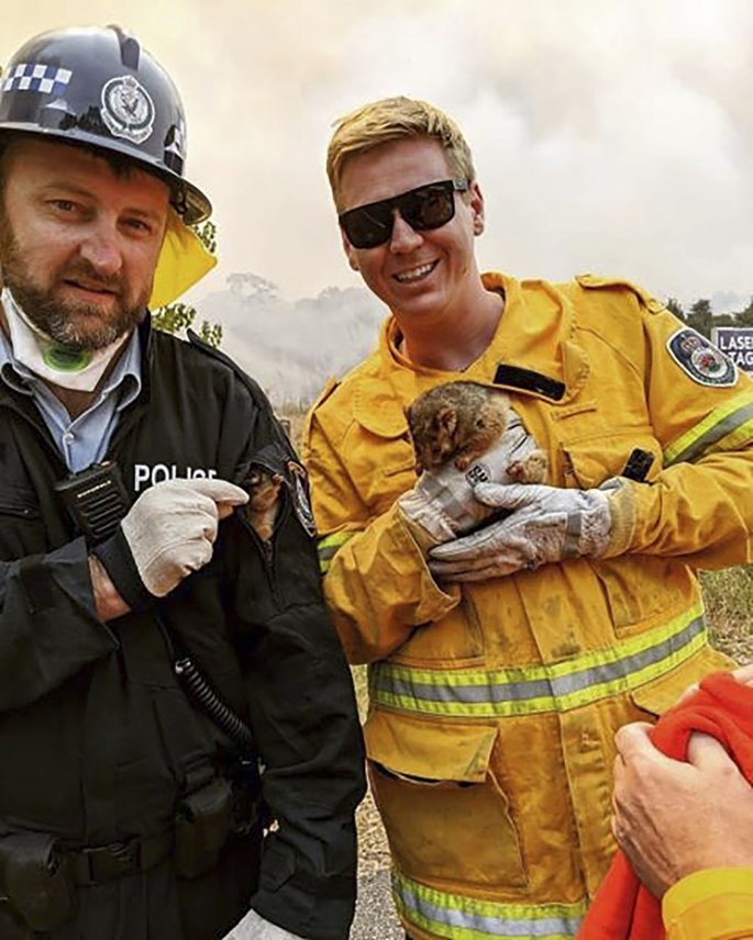 Πυροσβέστης και αστυνομικός κρατούν ένα πόσουμ και το μικρό του αφού το έσωσαν από τις φλόγες/Twitter@NSWRFS via AP