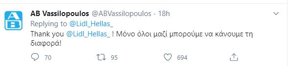Φαίνεται, ωστόσο, πως ο κ. Τσιάρτας (και όσοι συντάσσονται με την άποψή του) θα πρέπει να ξεχάσουν και τα καταστήματα της Lidl Ελλάς, αφού η εταιρεία έκανε την «έκπληξη» και αναδημοσίευσε τη συγκεκριμένη αφίσα, γράφοντας μάλιστα στη λεζάντα το δικό της μότο: «Στον δρόμο για ένα καλύτερο αύριο, είμαστε όλοι μαζί...», με την ΑΒ να απαντά: «Ευχαριστούμε Lidl Ελλάς! Μόνο όλοι μαζί μπορούμε να κάνουμε τη διαφορά!».
