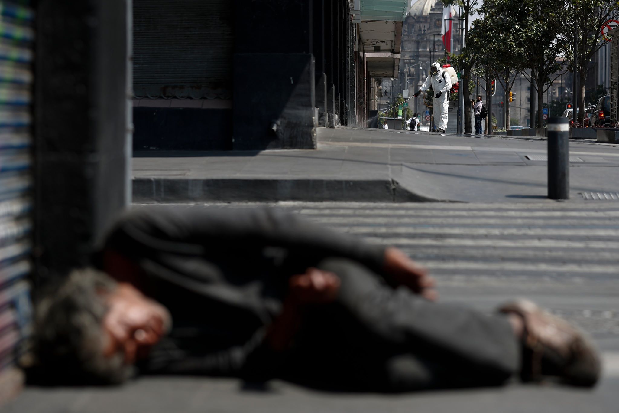 Οι Αρχές στην πόλη του Μεξικού ψεκάζουν για απολύμανση, ενώ λίγο παρακάτω κοιμάται στον δρόμο ένας άστεγος. Η χώρα βρίσκεται αντιμέτωπη με την απειλή οικονομικής κρίσης, της μεγαλύτερης που θα έχει βιώσει από τον περασμένο αιώνα. Το «κλικ» από το Associated Press: