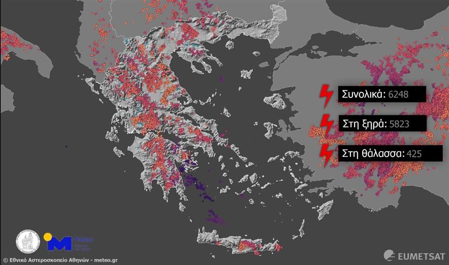 Η ανάλυση δεδομένων από τον Ευρωπαϊκό μετεωρολογικό δορυφόρο τρίτης γενιάς Meteosat-12 και το Lightning Imager (LI) όργανο που φέρει, έδειξε ότι μέχρι το απόγευμα είχαν καταγραφεί περισσότερες από 6.000 ηλεκτρικές εκκενώσεις. Σημειώνεται ότι ως ηλεκτρικές εκκενώσεις ορίζεται το σύνολο αυτών που συμπεριλαμβάνει τους κεραυνούς (εκκενώσεις μεταξύ νεφών και εδάφους), τις ηλεκτρικές εκκενώσεις μεταξύ νεφών καθώς και τις ηλεκτρικές εκκενώσεις μεταξύ νεφών και του περιβάλλοντος αέρα.